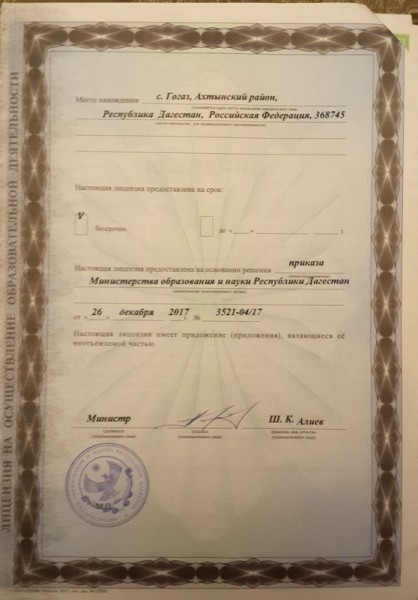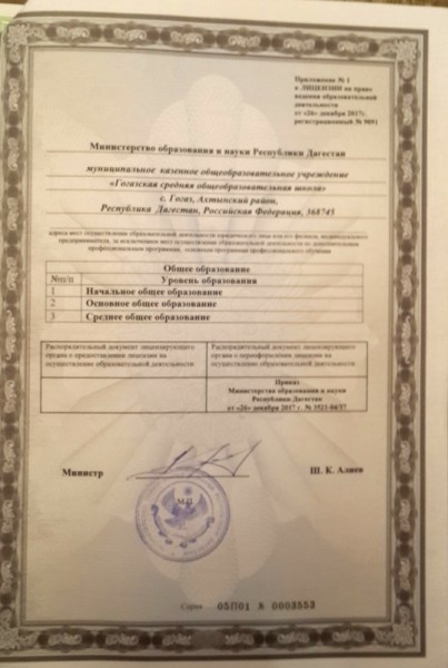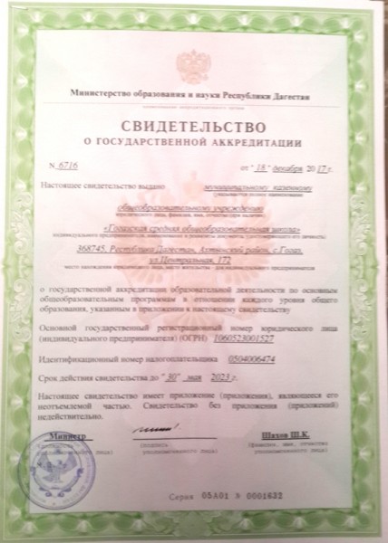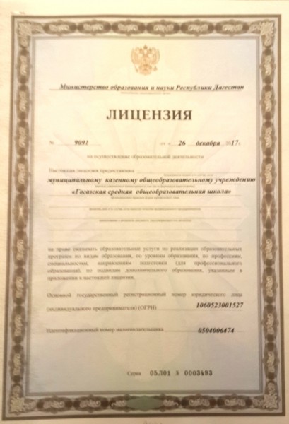по реализации образовательных программ общего образования(начального общего образования, основного общего образования, среднего общего образования) – 368745 МКОУ «Гогазская СОШ». Ахтынский район. Улица Центральная №172. Республика Дагестан.